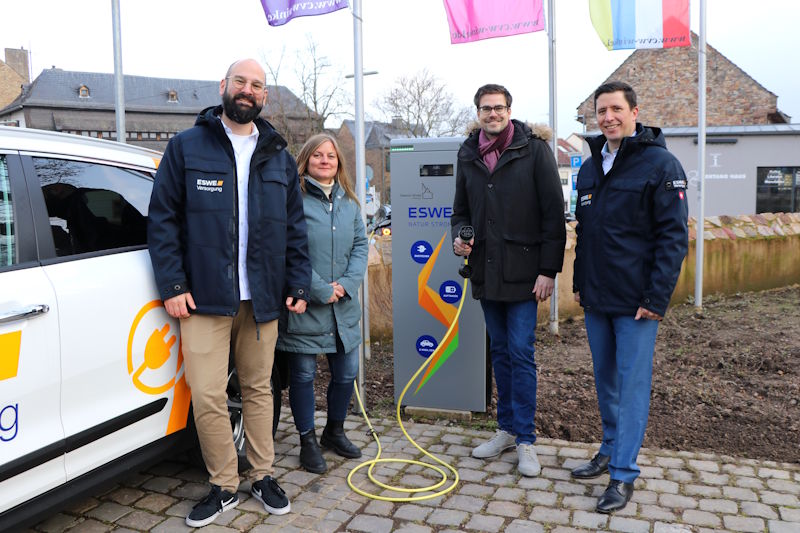 In Oestrich-Winkel haben Bürgermeister Carsten Sinß und Bauamtsleiterin Lisa Niegel jetzt zusammen mit Jan Lenzen und Erik Dahlhäuser von der ESWE Versorgungs AG eine neue E-Ladesäule an der Brentanoscheune in Betrieb genommen. Es handelt sich dabei um eine sogenannte „Normal-Ladesäule“, die auf dem Parkplatz vor dem Gebäude steht.